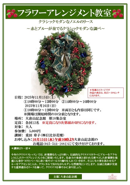【満員御礼】11月15日(土)16日(日)フラワーアレンジメント教室/クラシックモダンなノエルのリース~赤とブルーが奏でるクラシックモダンな調べ~