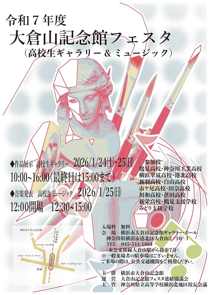 ◇令和7年度大倉山記念館フェスタ(高校生ギャラリー&ミュージック)◆作品展示(ギャラリー)1月24日(土)・25日(日)10:00~16:00(最終日は15:00まで)◆音楽発表(ミュージック)1月25日(日)12:00開場、12:30~15:00